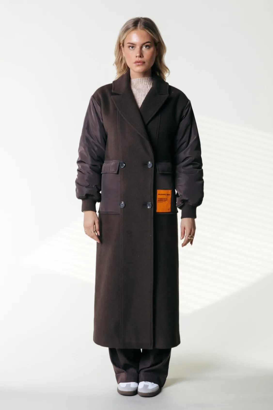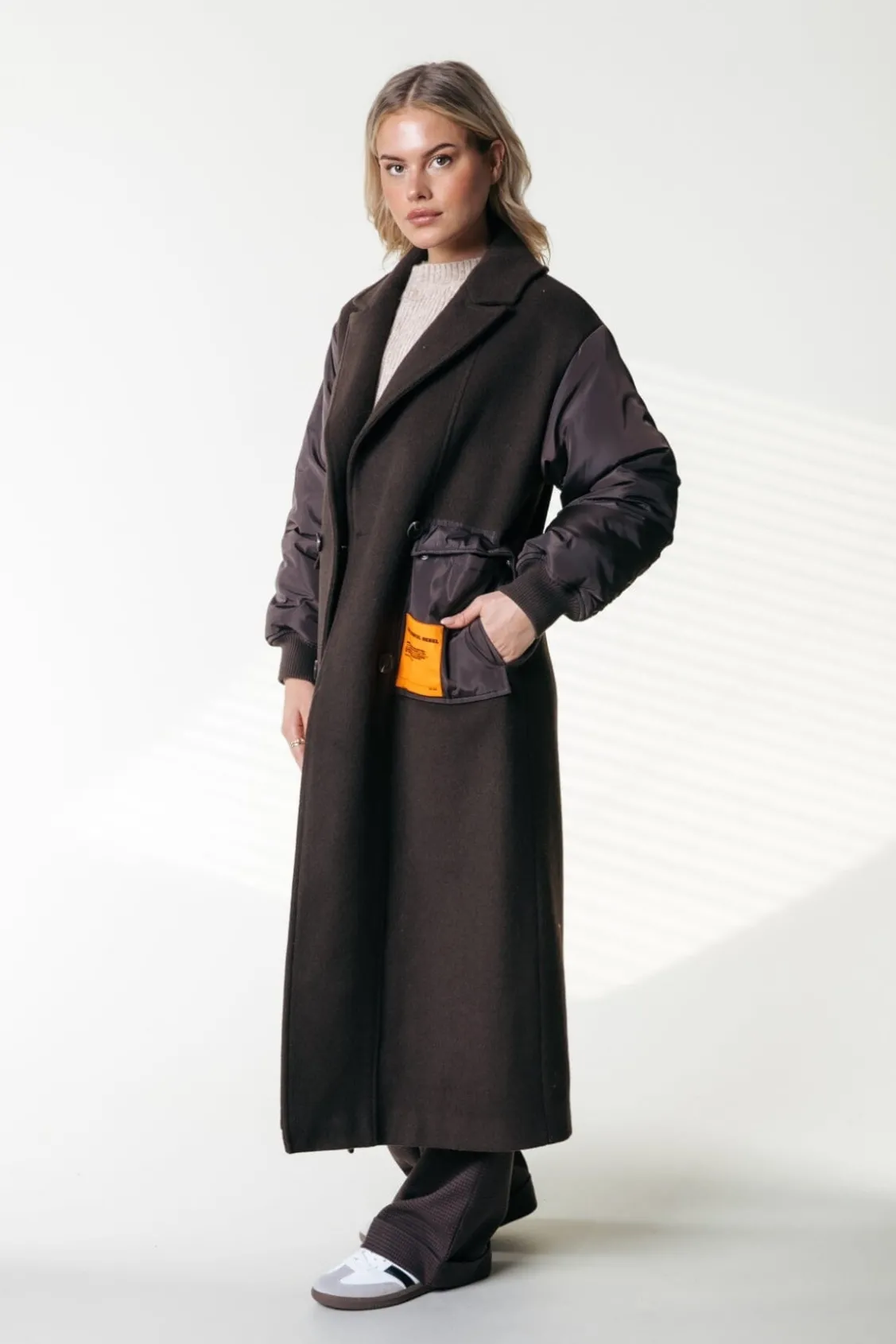 Long coat 50% Polyester, 50% Wool Stomerij reiniging Regular fit Steekzakken Knoopsluiting Model is 1.70m en draa…